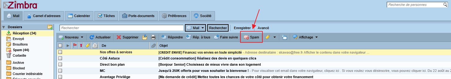 Free utilise une interface (actuellement basée sur Zimbra) avec un filtrage antispam automatique (scores SpamAssassin). Tu peux renforcer son efficacité :