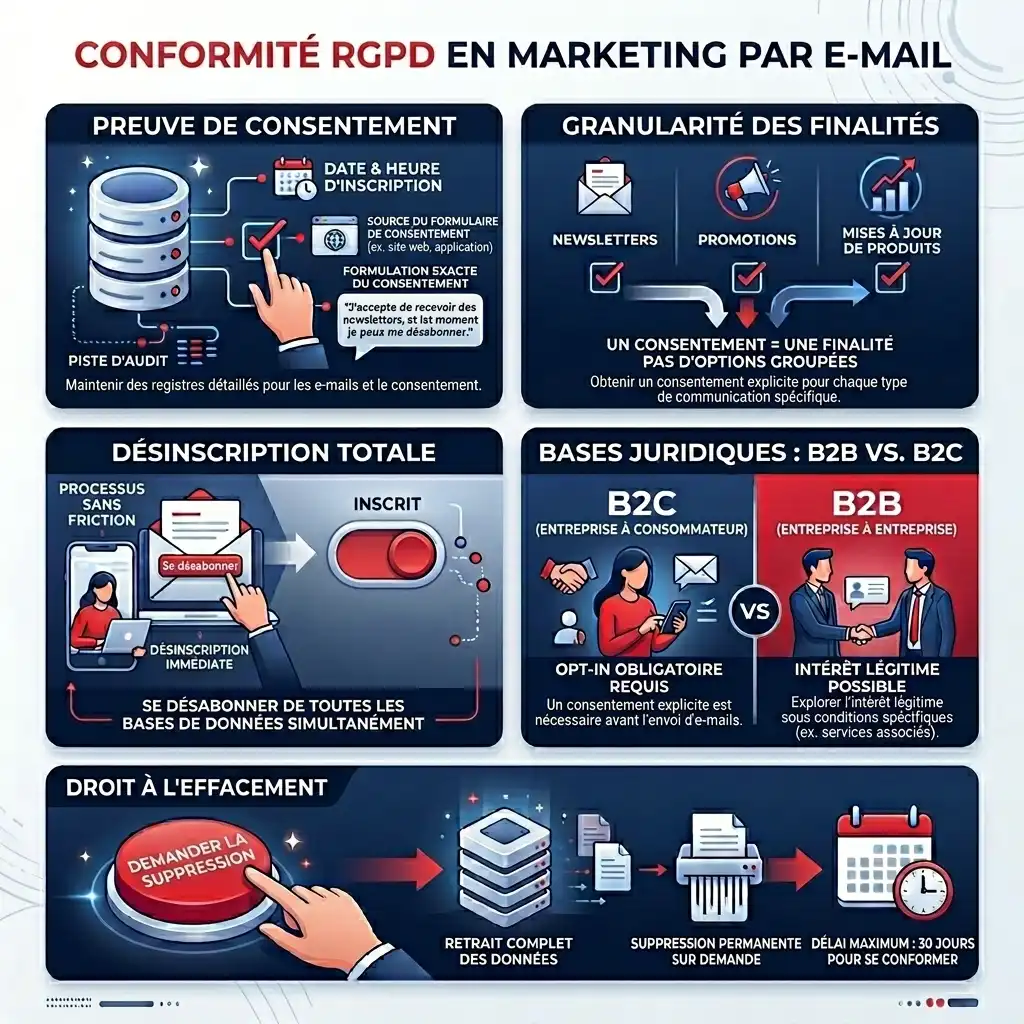 La mise en conformité RGPD en emailing repose sur quatre réalités souvent ignorées. Première : le consentement sans preuve documentée est juridiquement nul, la délibération SAN-2025-017 en est la démonstration la plus récente et la plus coûteuse.