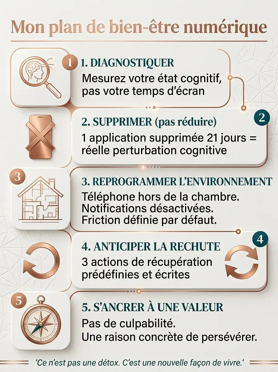 C’est le genre de lucidité cruelle qui prouve que vous avez déjà le diagnostic — ce qui vous manque, c’est un plan de bien-être numérique qui tienne dans la durée. Pas une liste de résolutions oubliées en mars. Un plan construit autour de qui vous êtes vraiment, de vos déclencheurs réels, de la vie que vous voulez mener.