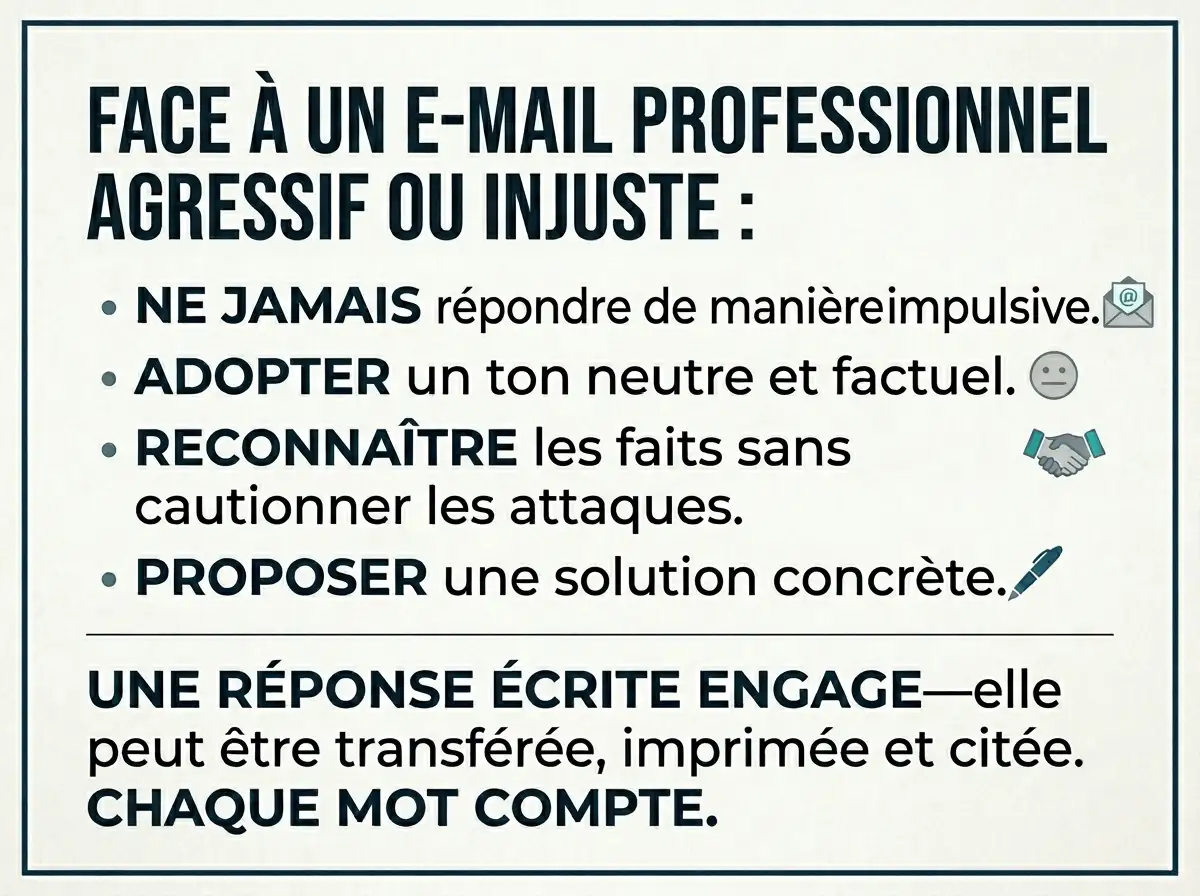Face à un email professionnel agressif ou injuste : ne jamais répondre à chaud, adopter un ton neutre et factuel, reconnaître les faits sans valider les attaques, et proposer une solution concrète. La réponse écrite engage — elle peut être transférée, imprimée, citée. Chaque mot compte.